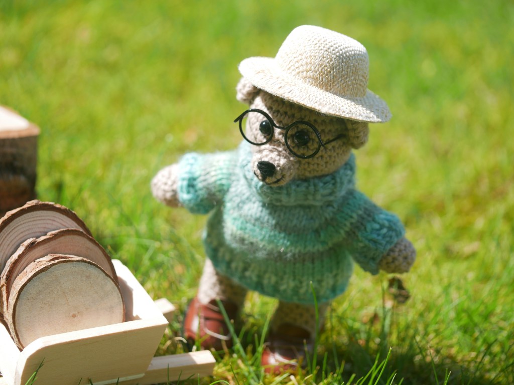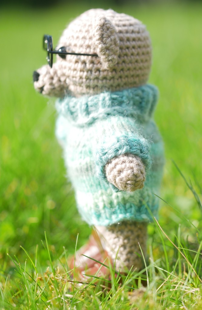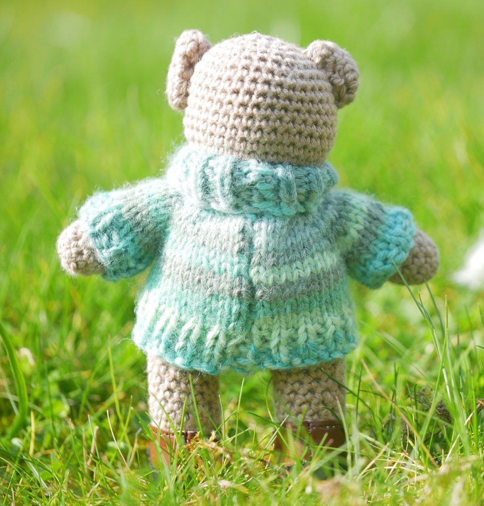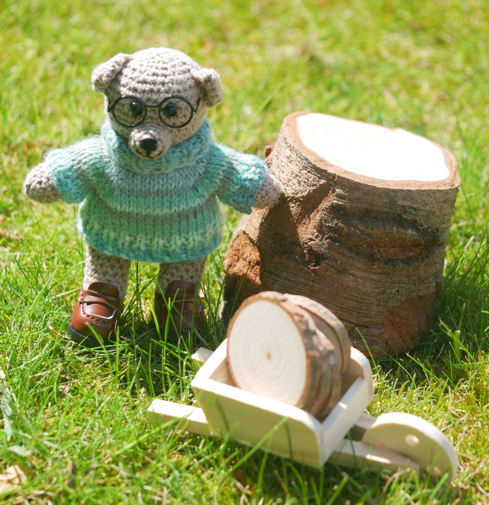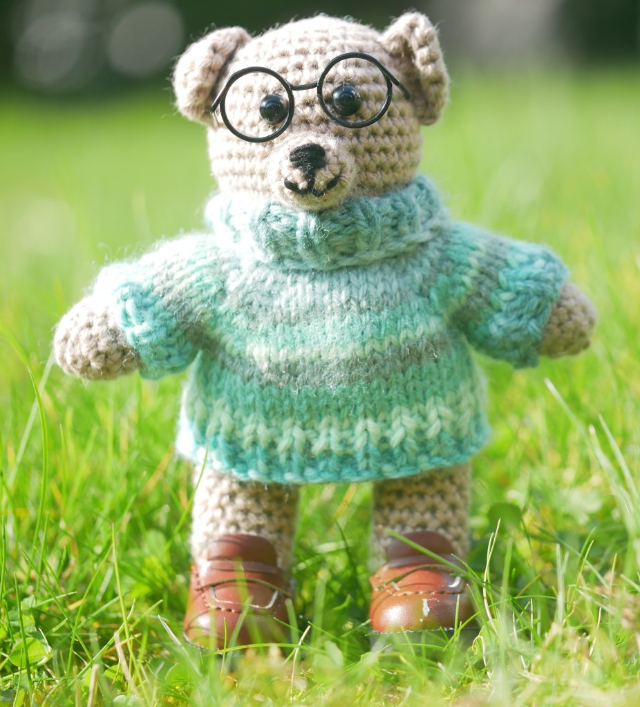 FOR SALE: Skog is Swedish for wood or forest, and this little bear has been helping out amongst the trees. One hand-made crochet teddy bear (#ScandiStyle_Dolls pattern). A hand sized, light stone coloured, hand-made teddy in cotton yarn. This teddy has safety eyes and embroidered facial details, and comes with removable glasses, jumper, hat and shoes.